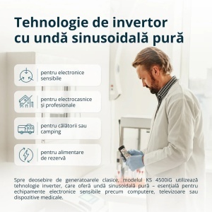 - Modulul electronic integrat, controlat de un microprocesor, gestionează funcționarea generatorului și asigură o tensiune de ieșire stabilă de 230 V / 50 Hz sub formă de undă sinusoidală pură — ideală pentru echipamente electronice sensibile.