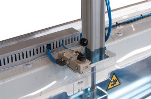 - Este echipat cu 4 pistoane pneumatice pentru blocarea materialului, poate taia in ambele sensuri cu viteza reglabila si este dotat cu sistem electromecanic pentru intreruperea taierilor la dimensiunea dorita.