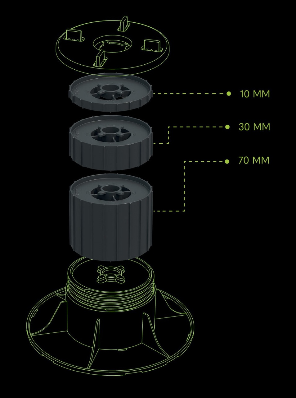 - Un sistem reglabil flexibil de pavaj și piedestal de pardoseală conceput pentru înălțimi între 20 mm și 1030 mm.