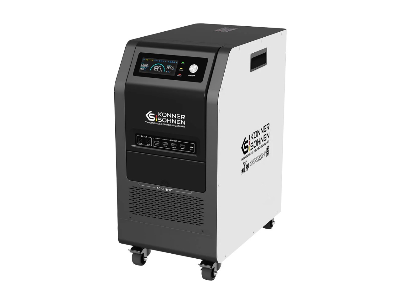 Stația de încărcare de înaltă performanță cu conectare staționară KS 5200PS de la Könner & Söhnen® combină puterea mare cu mobilitatea. Este echipată cu un acumulator LiFePO4 de mare capacitate, un invertor de sinusoidală pură și are posibilitatea de a se încărca rapid de la panouri solare – până la 5 kW! Datorită caracteristicilor tehnice, stația oferă alimentare de lungă durată chiar și în caz de întreruperi prelungite de electricitate. În funcție de scenariul de utilizare, puterea stației este suficientă pentru a alimenta un birou mic (10 calculatoare, imprimantă, router) timp de 5-7 ore, un apartament timp de 24 de ore, iar datorită încărcării rapide, veți reîncărca rapid bateria pentru utilizare ulterioară.