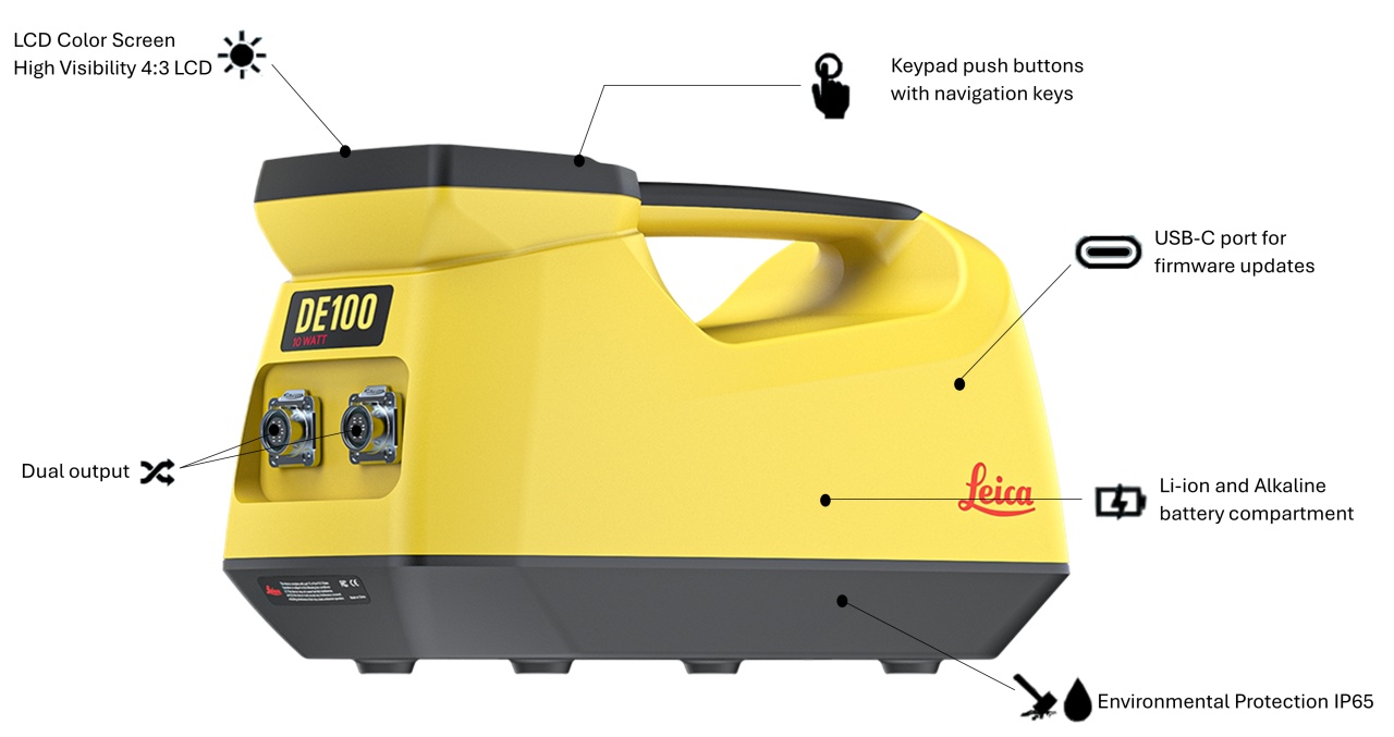 - Sistemul Leica DT100 este integrat cu DE100, un transmițător de semnal de 10 wați capabil să furnizeze până la 1 A de curent maxim, îmbunătățind transmisia semnalului de-a lungul utilităților.